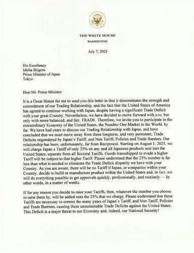 이시바 시게루 일본 총리에게 보낸 이 서한에서 트럼프 대통령은 미국의 대(對)일본 무역적자를 강조하면서, 일본이 이번 관세에 맞서 대미 관세를 올리면 미국도 그만큼 관세율을 더 올릴 것이라고 경고했다.