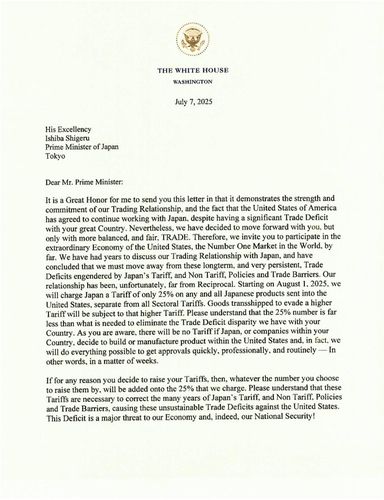 이시바 시게루 일본 총리에게 보낸 이 서한에서 트럼프 대통령은 미국의 대일 무역적자를 강조하면서, 일본이 이번 관세에 맞서 대미 관세를 올리면 미국도 그만큼 관세율을 더 올릴 것이라고 경고했습니다.
