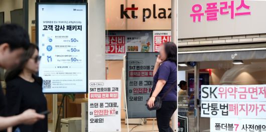 KT와 LG유플러스는 SK텔레콤의 유심 해킹 사태를 간접적으로 언급하며 이탈 고객 잡기에 나서고 있다. KT는 자사 홈페이지에 ‘S사 위약금 면제 발표/안전하게 KT로 번호이동하세요’라는 배너를 내걸고 ‘5G 무제한·무약정 요금제 매월 2만5000포인트 페이백’이라며 홍보에 나섰다. LG유플러스도 ‘위약금 없는 번호이동 고객님! 쓰던 폰 그대로, 보안 걱정 없는 LG유플러스로 오세요’라는 안내문을 띄웠다.