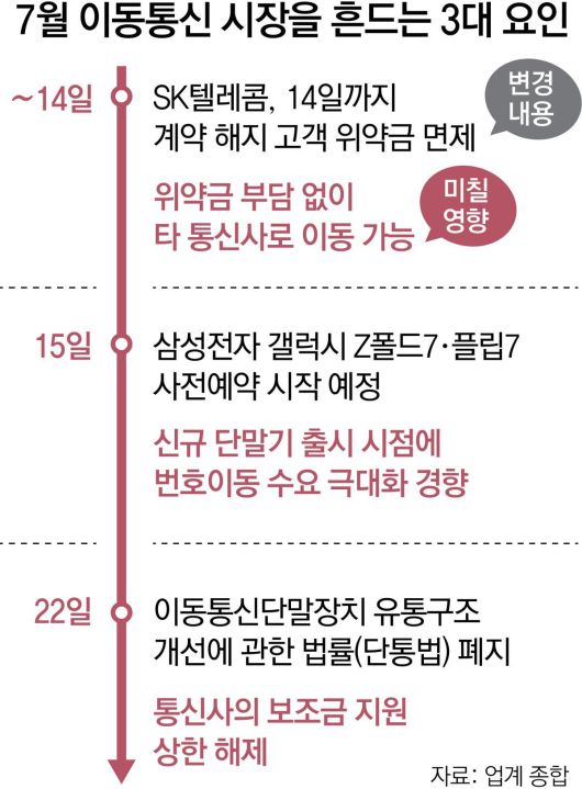 업계에서는 통신 3사의 고객 유치전이 당분간 이어질 것으로 보고 있다. 삼성전자 신작인 갤럭시 Z폴드7과 플립7 사전예약도 15일 시작될 예정이기 때문이다. 통상 신규 단말기가 출시되면 번호이동 수요가 극대화된다.