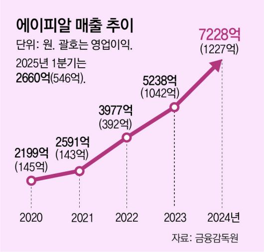 7일 금융감독원 전자공시에 따르면 에이피알 매출은 2020년 2199억 원에서 2024년 7228억 원으로 증가했다. 같은 기간 영업이익은 145억 원에서 1227억 원으로 10배 가까이 늘어났다. 2025년 1분기(1∼3월)엔 매출 2660억 원, 영업이익 546억 원으로 시장 기대치를 크게 웃도는 성과를 냈다. 지난해 2월 상장 당시 1조9000억 원이었던 시총은 7일 종가 기준 5조6876억 원으로 LG생활건강(5조291억 원)을 뛰어넘었다.