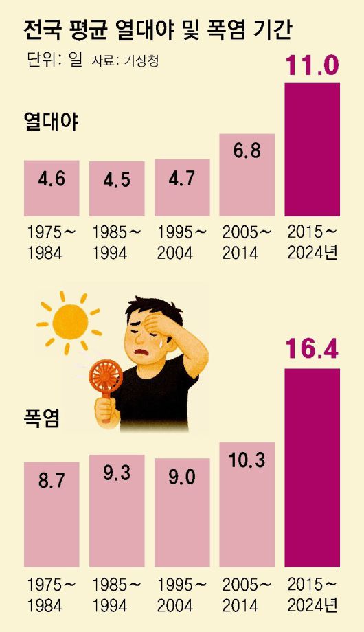 이날 기상청에 따르면 지난 10년간(2015∼2024년) 전국 연평균 열대야 일수는 11일로 나타났다. 1975∼1984년 연평균 열대야 일수가 4.6일이었던 것과 비교하면 열대야 일수가 2.4배로 늘어났다. 열대야는 전날 오후 6시부터 다음 날 오전 9시까지 밤 최저기온이 25도 이상인 경우를 뜻한다. 너무 더워서 잠들기 어렵다는 것이다.
