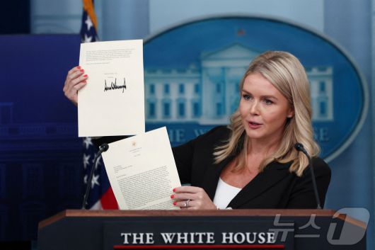 (워싱턴DC 로이터=뉴스1) 류정민 특파원 = 캐롤라인 레빗 백악관 대변인 7일(현지시간) 워싱턴DC 백악관 열린 정례 브리핑에서 도널드 트럼프 미국 대통령이 이재명 한국 대통령에게 보내는 관세 서한을 들어 보이고 있다.2025.07.07 ⓒ 로이터=뉴스1 Copyright ⓒ 뉴스1. All rights reserved. 무단 전재 및 재배포, AI학습 이용 금지.