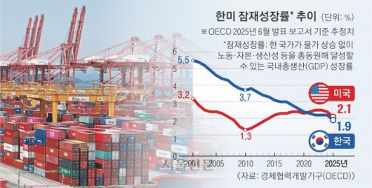세계 1위 경제 대국인 미국보다 성장 동력이 약화했다는 점은 심각성을 더한다. 고도성장을 이룬 선진국일수록 잠재성장률이 낮은 편인데 한국은 2021년 2.3%로 하락하며 2.4%인 미국에 역전당한 이후 5년 연속 따라잡지 못하고 있다.