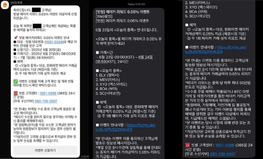 빗썸 관계자는 “최근 일부 고객에게 안내된 이벤트는 공식 리워드 프로그램과는 무관한 것으로, 내부 기준에 따라 제한적으로 운영된 일반적인 마케팅 활동이었다”라며 “증권시장에서도 거래 활성화를 위한 수수료 우대나 타깃 이벤트는 흔히 이뤄지는 만큼, 해당 이벤트 역시 시장 가격이나 구조에 영향을 줄 수 있는 성격은 아니다”라고 설명했다.