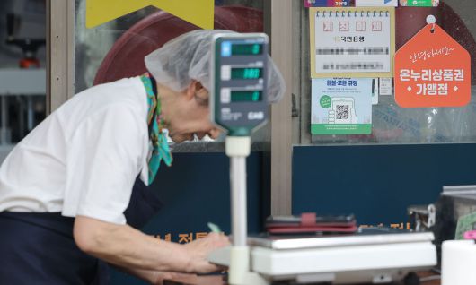 정부가 민생회복 소비쿠폰 1차 지급계획을 발표한 6일 서울의 한 전통시장 점포에 기존 골목경제 소비 활성화를 위한 온누리상품권 가맹 팻말이 붙어 있다. 연합뉴스 |