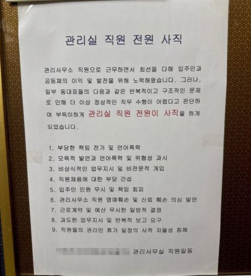 해당 글에는 "일부 동대표들의 반복적이고 구조적인 문제로 인해 더 이상 정상적인 직무 수행이 어렵다고 판단해 부득이하게 관리실 직원 전원이 사직하게 됐다"고 적혀 있다.