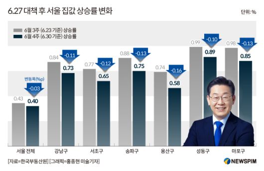 한국부동산원에 따르면 대책 발표 직후인 6월 마지막 주 서울 아파트값 주간 상승률은 0.40%로, 직전 주(0.43%)보다 0.03%포인트 둔화하며 22주에 걸친 상승세를 마무리했다. 비록 소폭의 둔화처럼 보이지만, 22주간 멈추지 않고 가속페달을 밟던 시장의 기세가 마침내 꺾였다는 점에서 중요한 변곡점으로 해석된다.