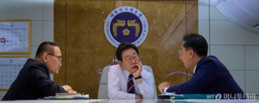 G7(주요 7개국) 정상회의에 참석하는 이재명 대통령이 지난달 16일 공군 1호기에서 캐나다로 향하며 위성락 국가안보실장(왼쪽), 김태진 의전장(오른쪽)과 회의하고 있다. / 사진=뉴시스 |