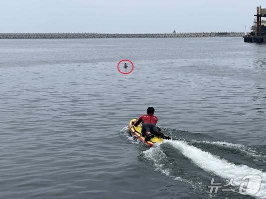 지난 7일 오후 강원 속초 속초해경 전용부두 인근 해상에서 진행된 구조·구급 대응 훈련에 동참한 기자.원 안은 요구조자.(속초해경 제공, 재판매 및 DB 금지) 2025.7.8/뉴스1 |