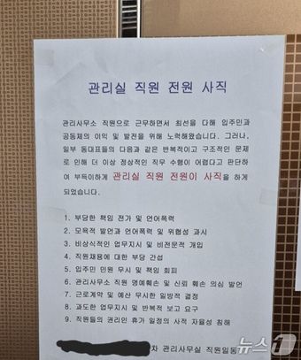 해당 안내문엔 "일부 동대표들의 반복적이고 구조적인 문제로 정상적인 직무 수행이 어렵다고 판단해 부득이하게 관리실 직원 전원이 사직하게 됐다"는 내용이 적혀 있었다.