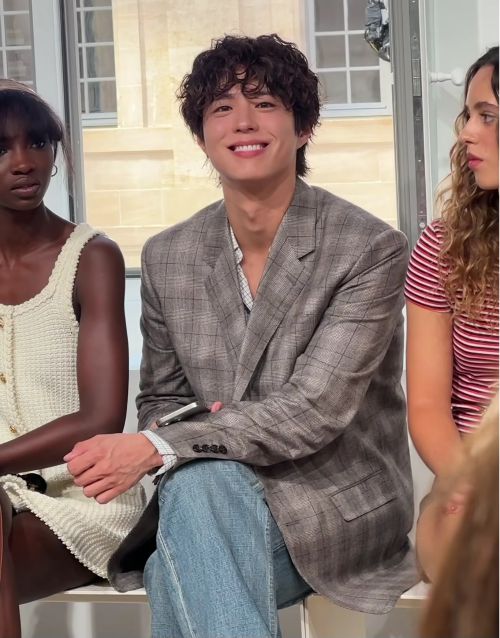 첫 번째 사진에서 박보검은 두 명의 해외 여성 모델 사이에 앉아 있었다. 그레이 체크 재킷과 깔끔한 셔츠, 데님 팬츠를 매치한 룩은 포멀하지만 편안했고, 살짝 구부린 자세는 긴장과 유연함 사이를 자연스럽게 오갔다. 눈빛은 정면을 향했지만, 주변의 시선은 모두 그에게 향해 있었다.