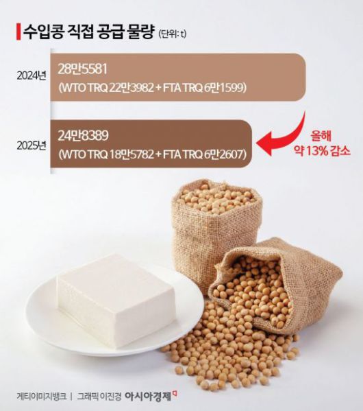 수입관리 품목으로 정부가 공급을 통제하고 있는 콩은 '저율관세할당(TRQ)' 제도를 통해 세계무역기구(WTO) TRQ와 자유무역협정(FTA) TRQ 물량을 공급한다. 매년 약 28만t을 공급하는데 이 중 75% 이상을 차지하는 WTO 물량에서 기본 물량만 공급하고 증량을 하지 않아 약 3만8000t이 부족하게 된 것이다. 수입 콩 사용 업계는 국영무역이나 수입권 공매 등을 통해서도 일부 원료를 조달할 수 있지만, 이 물량 역시 지난해보다 감소했다는 설명이다.
