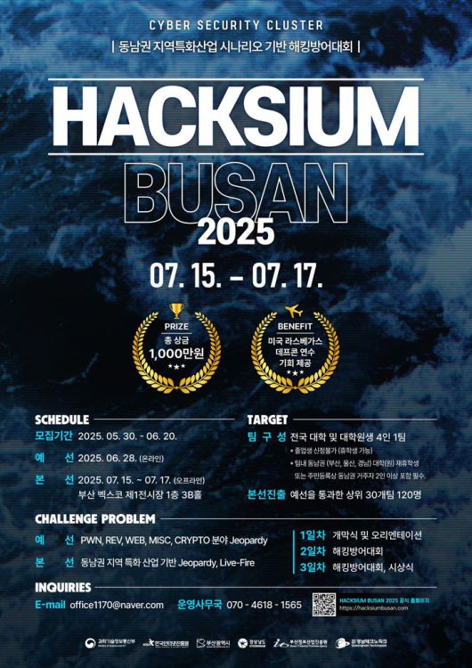 [부산=뉴시스]권태완 기자 = 부산시는 오는 15일부터 17일까지 해운대구 벡스코에서 동남권 지역특화 산업 시나리오 기반의 해킹방어대회 '2025 핵시움(HACK SIUM) 부산'을 개최한다고 8일 밝혔다.