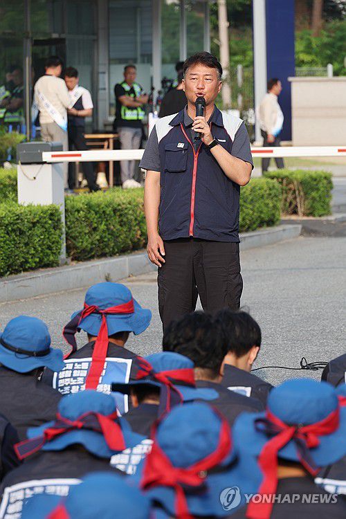 (김제=연합뉴스) 임채두 기자 = 양경수 전국민주노동조합총연맹(민주노총) 위원장이 8일 전북 김제의 ㈜일강 공장에서 전국금속노조 일강지회 조합원들과 만나 발언하고 있다. 2025.7.8
