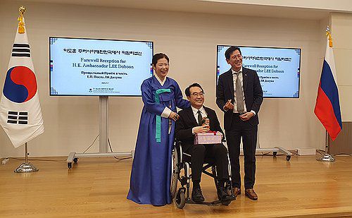 (모스크바=연합뉴스) 최인영 특파원 = 이도훈 주러시아대사가 7일(현지시간) 러시아 모스크바 주러대사관에서 열린 이임 리셉션에서 기념 촬영하고 있다. 2025.7.8