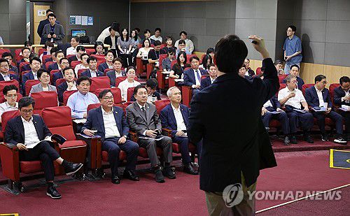 (서울=연합뉴스) 김주형 기자 = 8일 서울 여의도 국회 의원회관에서 열린 '새 정부 국정동력 붐업! 코리아 프리미엄 시대로!' 경제는 민주당 : 코스피 5000시대 실현을 위해 민주당이 할 일 : 부동산 편에 참석한 의원들이 이광수 광수네 복덕방 대표의 강연을 듣고 있다. 2025.7.8