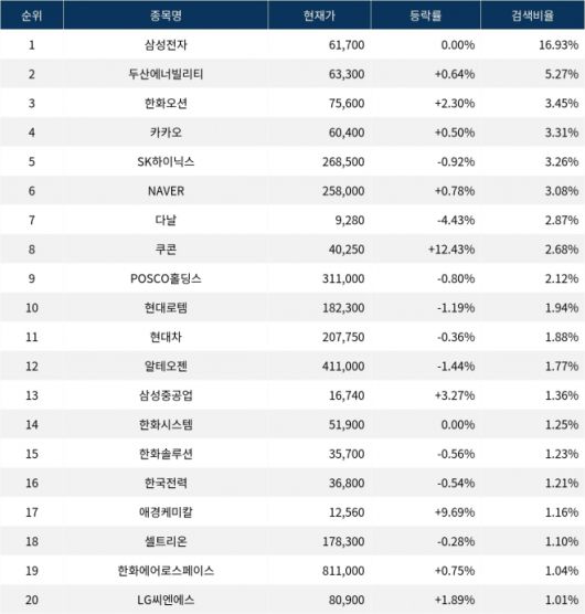 이어 두산에너빌리티(034020)가 검색비율 2위를 기록하며 0.64%의 상승세를 기록하고 있다. 검색비율 3위의 한화오션(042660)은 2.30% 상승하며 순조롭게 출발하는 모습이다. 검색비율 4위 카카오(035720)는 개장 초반부터 0.50%의 상승률을 보이고 있다. 검색비율 5위 SK하이닉스(000660)는 0.92% 하락하며 주가가 다소 하락하고 있다.