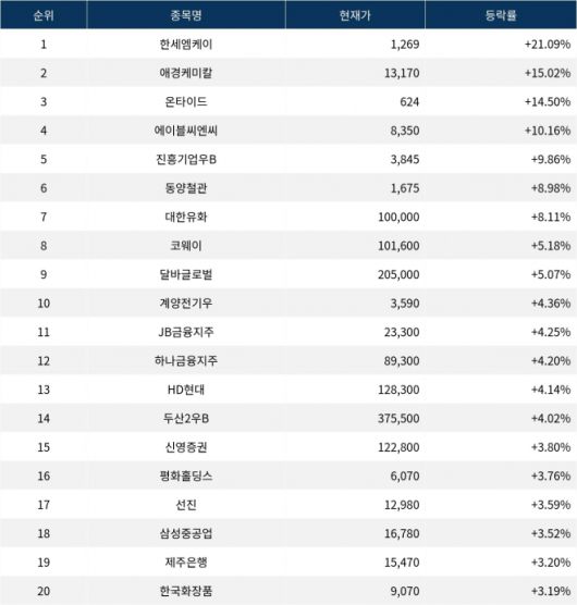 6위 동양철관(008970)은 현재가 1,675원으로 8.98% 상승 중이다. 7위 대한유화(006650)는 현재가 100,000원으로 8.11% 상승 중이다. 8위 코웨이(021240)는 현재가 101,600원으로 5.18% 상승 중이다. 9위 달바글로벌(483650)은 현재가 205,000원으로 5.07% 상승 중이다. 10위 계양전기우(012205)는 현재가 3,590원으로 4.36% 상승 중이다.