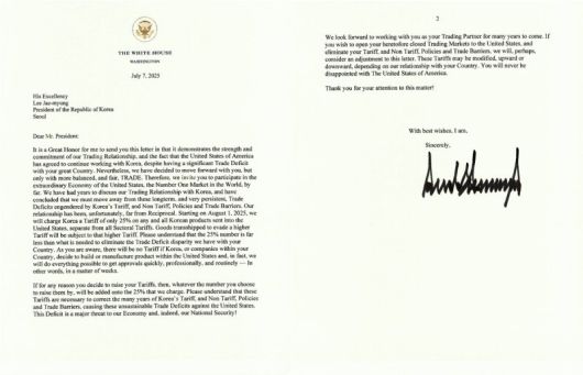 2쪽짜리 이 서한에는 오는 8월 1일부터 양국 수출품에 일괄 25%의 관세를 부과하겠다는 내용이 담겼다. 미국 내 생산을 유도하면 면제해주되 보복 관세를 시행할 경우 관세를 더 높이겠다는 경고도 포함됐다.