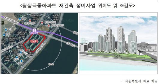 광장극동 아파트 재건축 정비사업은 광진구 광장동 218-1 일대(7만 8843.4㎡)의 극동1차(5개동, 448세대)와 극동2차(11개동, 896세대)를 대상으로 진행 중인 사업으로, 한강변 중점경관관리구역에 위치한 노후 아파트 단지의 주거환경을 개선하기 위한 사업이다.