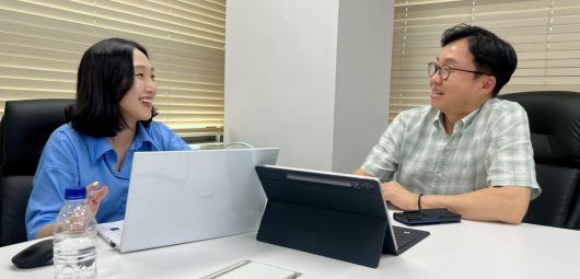 박수용 AI소프트웨어융합대학원장(오른쪽)과 박혜진 주임교수가 'AI·디지털자산 최고위 과정' 프로그램을 논의하고 있다. |