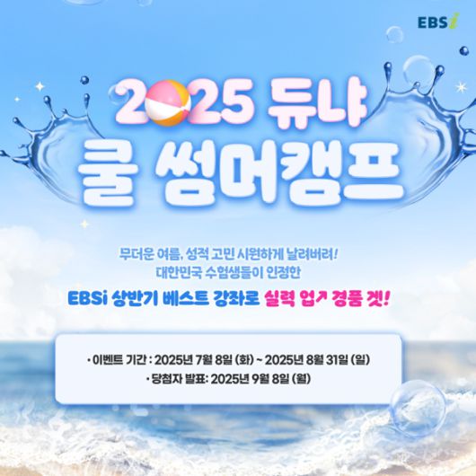 EBS(사장 김유열)가 무더운 여름, 성적 고민으로 지친 수험생들을 위해 '2025 듀냐 쿨 썸머캠프’ 이벤트를 EBS 고교강의 사이트 (이하 'EBSi’)에서 진행한다고 8일 밝혔다.
