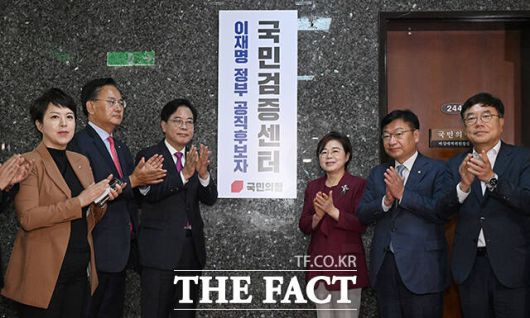 [더팩트ㅣ국회=배정한 기자] 송언석 국민의힘 비상대책위원장 겸 원내대표 등 원내지도부가 8일 국회에서 열린 '이재명 정부 공직후보자 국민검증센터' 현판식에 참석해 박수를 치고 있다.
