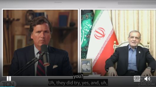 미국 언론인 터커 컬슨이 7일 마수드 페제슈키안 이란 대통령과 화상 회견을 하고 있다. |