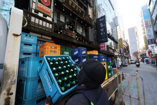 1월 23일 서울 시내 식당가에서 주류업체 관계자가 맥주와 소주를 납품하고 있다. |
