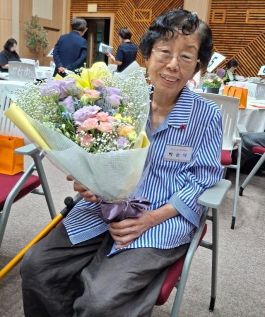 전북 전주 치명자산성지 평화의전당 유항검홀에서 열린 ‘희망 2025 캠페인 유공자 시상식’에서 폐지 등을 모아 장학금을 기부한 박순덕 할머니(89)가 꽃다발을 들고 앉아 있다. 정읍시 제공 |