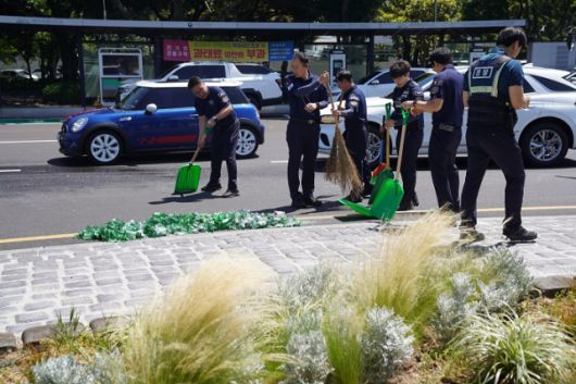 사고를 목격한 도청 청원경찰들은 곧바로 빗자루와 쓰레받이를 들고 현장에 출동해 도로에 흩어진 병 조각과 상자를 신속히 수거했다. 현장 정리는 약 20분 만에 마무리됐으며, 차량 통행은 오전 11시 10분경 정상화됐다.