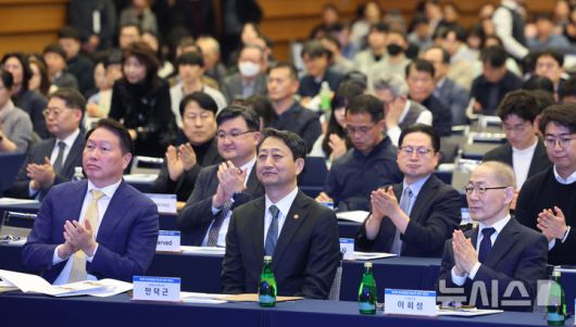 [서울=뉴시스] 김진아 기자 = 최태원(앞줄 왼쪽부터) 대한상의 회장, 안덕근 산업통상자원부 장관, 이회성 CF연합 회장이 31일 서울 중구 대한상공회의소에서 열린 '제7회 탄소중립과 에너지 정책 세미나'에 참석해 있다. 2025.03.31. bluesoda@newsis.com |