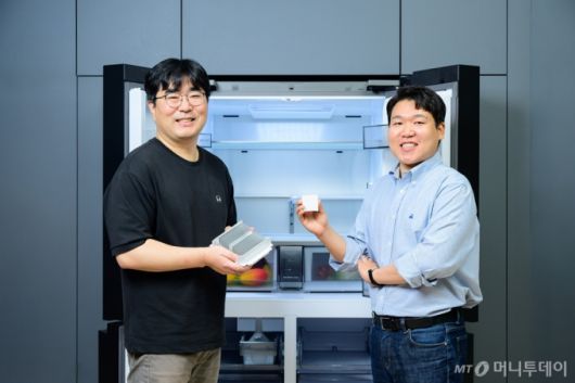정하진 삼성전자 DA사업부 냉장고 플랫폼 랩 프로(왼쪽)와 정성진 삼성리서치 라이프솔루션팀의 프로(오른쪽)가 비스포크 AI 하이브리드 냉장고 앞에서 포즈를 취하고 있다./사진=삼성전자 |