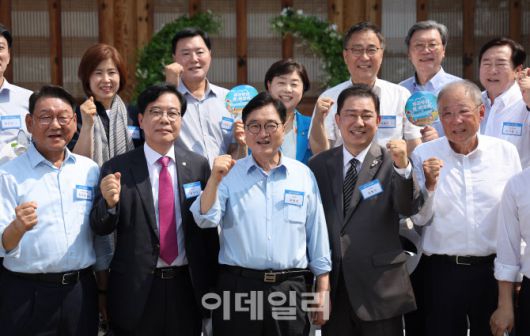 [이데일리 노진환 기자] 8일 서울 여의도 국회 사랑재에서 열린 K-바캉스 캠페인 "K-관광 올여름은 국내로!"에 참석한 우원식 국회의장과 김병기 더불어민주당 당대표 직무대행 겸 원내대표, 송언석 국민의힘 비상대책위원장 겸 원내대표 등 참석자들이 구호를 외치고 있다.