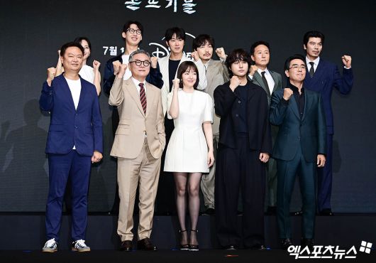 (엑스포츠뉴스 박지영 기자) 8일 오전 서울 여의도 콘래드 호텔에서 디즈니+ 오리지널 시리즈 '파인: 촌뜨기들' 제작발표회가 진행됐다. 이날 제작발표회에 참석한 강윤성 감독, 류승룡, 양세종, 임수정, 김의성, 김성오, 김종수, 이동휘, 정윤호, 이상진, 김민이 포토타임을 갖고 있다. 박지영 기자 jypark@xportsnews.com