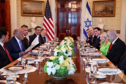 (워싱턴 로이터=뉴스1) 최종일 선임기자 = 도널드 트럼프 미국 대통령이 7일(현지시간) 워싱턴 D.C. 백악관에서 개최된 만찬장에서 베냐민 네타냐후 이스라엘 총리의 트럼프 대통령 노벨 추천서를 살펴보고 있다. 2025.07.07 ⓒ 로이터=뉴스1 Copyright ⓒ 뉴스1. All rights reserved. 무단 전재 및 재배포, AI학습 이용 금지.