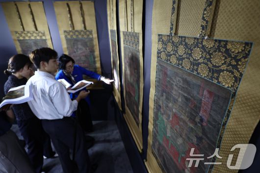 (서울=뉴스1) 김도우 기자 = 8일 서울 종로구 국립고궁박물관에서 열린 '감지금니 대방광불화엄경 주본 권22'와 '시왕도' 언론공개회에서 관계자들이 문화재를 살펴보고 있다. '감지금니 대방광불화엄경 주본 권22'와 '시왕도'는 국가유산청과 국외소재문화유산재단이 일본에서 환수한 문화재로 수백 년의 시간이 지나도 보존 상태가 양호해 향후 다양한 연구와 전시 등에 활용될 것으로 기대된다. 2025.7.8/뉴스1