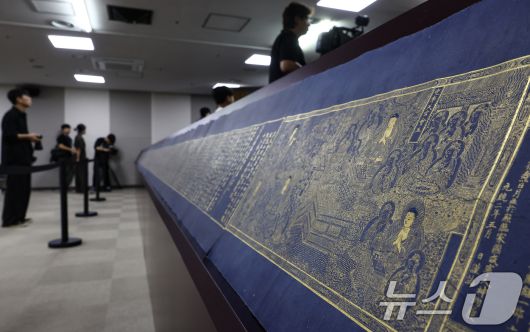 (서울=뉴스1) 김도우 기자 = 8일 서울 종로구 국립고궁박물관에서 열린 '감지금니 대방광불화엄경 주본 권22'와 '시왕도' 언론공개회에서 관계자들이 문화재를 살펴보고 있다. '감지금니 대방광불화엄경 주본 권22'와 '시왕도'는 국가유산청과 국외소재문화유산재단이 일본에서 환수한 문화재로 수백 년의 시간이 지나도 보존 상태가 양호해 향후 다양한 연구와 전시 등에 활용될 것으로 기대된다. 2025.7.8/뉴스1