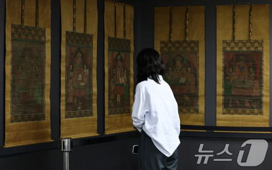 (서울=뉴스1) 김도우 기자 = 8일 서울 종로구 국립고궁박물관에서 열린 '감지금니 대방광불화엄경 주본 권22'와 '시왕도' 언론공개회에서 관계자들이 문화재를 살펴보고 있다. '감지금니 대방광불화엄경 주본 권22'와 '시왕도'는 국가유산청과 국외소재문화유산재단이 일본에서 환수한 문화재로 수백 년의 시간이 지나도 보존 상태가 양호해 향후 다양한 연구와 전시 등에 활용될 것으로 기대된다. 2025.7.8/뉴스1