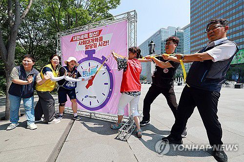 (서울=연합뉴스) 신현우 기자 = 전국서비스산업노동조합연맹 조합원들이 8일 서울 종로구 광화문광장에서 서비스연맹 총파업 선포 기자회견을 열고 사회대개혁을 앞당긴다는 뜻을 담은 퍼포먼스를 하고 있다. 2025.7.8