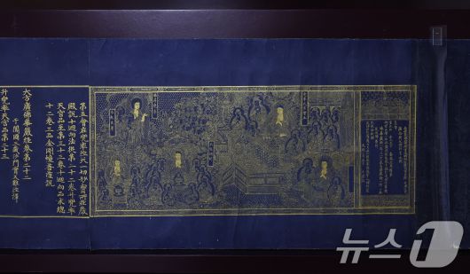 (서울=뉴스1) 김도우 기자 = 8일 서울 종로구 국립고궁박물관에서 열린 '감지금니 대방광불화엄경 주본 권22'와 '시왕도' 언론공개회에서 관계자들이 문화재를 살펴보고 있다. '감지금니 대방광불화엄경 주본 권22'와 '시왕도'는 국가유산청과 국외소재문화유산재단이 일본에서 환수한 문화재로 수백 년의 시간이 지나도 보존 상태가 양호해 향후 다양한 연구와 전시 등에 활용될 것으로 기대된다. 2025.7.8/뉴스1