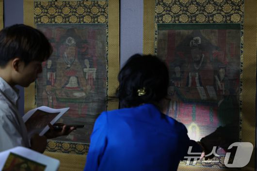 (서울=뉴스1) 김도우 기자 = 8일 서울 종로구 국립고궁박물관에서 열린 '감지금니 대방광불화엄경 주본 권22'와 '시왕도' 언론공개회에서 관계자들이 문화재를 살펴보고 있다. '감지금니 대방광불화엄경 주본 권22'와 '시왕도'는 국가유산청과 국외소재문화유산재단이 일본에서 환수한 문화재로 수백 년의 시간이 지나도 보존 상태가 양호해 향후 다양한 연구와 전시 등에 활용될 것으로 기대된다. 2025.7.8/뉴스1
