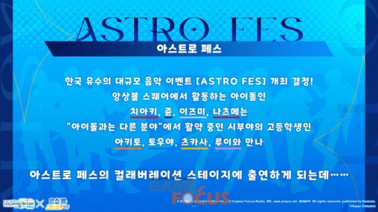 이번 이벤트는 한국(일본 이벤트에서는 일본이었으나 한국에서의 콜라보를 기념해 한국으로 설정이 바뀌었다)의 대규모 음악 이벤트 '아스트로 페스'에 참여하게 된 앙스타 4명의 멤버와 프로세카의 4명의 멤버가 특별한 콜라보레이션 스테이지에 참여한다는 스토리를 갖고 있다.