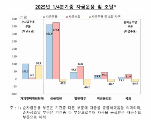 한국은행이 8일 공개한 '2025년 1분기 자금순환(잠정)' 통계에 따르면 지난 1분기 가계 및 비영리단체의 순자금 운용 규모는 92조9000억원으로 전 분기(62조6000억원) 대비 30조3000억원 늘었다. 분기 기준 통계편제(2009년) 이후 최대 규모다. 직전 최대치는 2023년 1분기 92조8000억원이었다. 순자금 운용은 해당 경제주체의 금융자산 거래액(자금 운용)에서 금융부채 거래액(자금 조달)을 뺀 값으로, 경제 주체의 여유자금으로 해석할 수 있다.