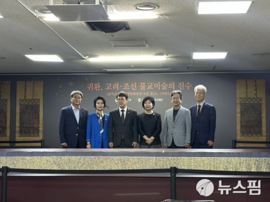 [서울=뉴스핌] 이지은 기자 = '감지금니 대방광불화엄경 주본 권22'와 '시왕도' 국내 환수 언론공개회에 참석한 배영일 마곡사 성보박물관장, 박은경 동아대학교 명예교수, 최응천 국가유산청장, 김정희 국외소재문화유산재단 이사장, 정용재 국립고궁박물관장, 곽창용 국외소재문화유산재단 사무총장(왼쪽부터). 2025.07.08 alice09@newspim.com |