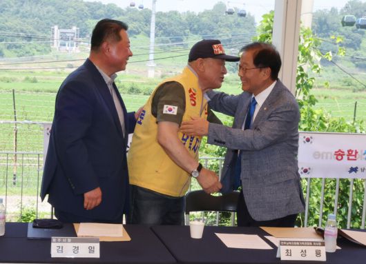 최성룡 납북자피해가족연합회 대표(가운데)와 김경일 파주시장(왼쪽), 더불어민주당 윤후덕 의원이 8일 경기 파주시 임진각에서 기자회견을 열고 대북전단 살포 중단을 선언한 뒤 서로 포옹하고 있다. 김태형 기자 xogud555@hani.co.kr |