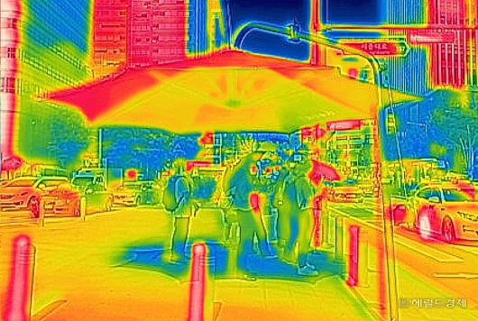 [헤럴드경제=임세준 기자] 서울 지역에 폭염경보가 발효 중인 8일 오전 서울 종로구 세종대로 사거리의 그늘막 아래 모여든 시민들이 파란색을 나타내고 있다. 열화상 카메라로 촬영된 사진은 기온이 높을수록 빨간색, 기온이 낮을수록 파란색을 나타낸다. 기상청에 따르면 이날 전국 대부분 지역에서 최고 체감온도가 35도 안팎으로 올라 매우 무덥겠고, 서쪽 지역과 제주도를 중심으로는 열대야가 나타나는 곳도 있겠다.