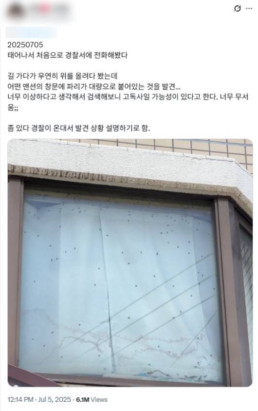 일본에 거주 중인 한 한국인이 창문에 몰린 파리 떼를 이상하게 여기고 신고를 한 사연이 화제다.