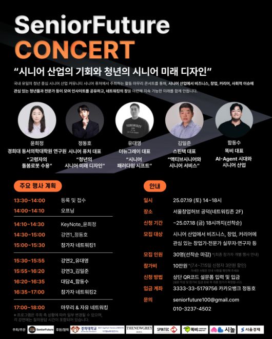 정동호 시니어퓨처 대표는 “청년들이 시니어 산업을 창업과 비즈니스의 기회로 연결할 수 있도록 이번 콘서트를 기획했다”며 “빠르게 변화하는 고령사회 속에서 청년들이 미래의 주체가 되는 생태계를 만들어가길 바란다”고 말했다.